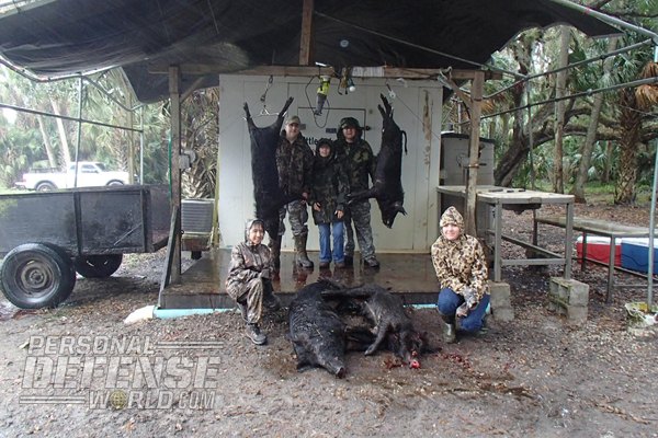 After about an hour, the dogs signaled they had found the first boar. We decided that my cousin would take it. She took a shot from the platform with her rifle and wounded the boar. She and my uncle then got off the vehicle to get a better shot as the boar moved away. My cousin killed the boar with her second shot. A short time later, at close range and with a .45/.410 Taurus pistol, my father and uncle each shot boars from a group that had run into a palmetto grove.