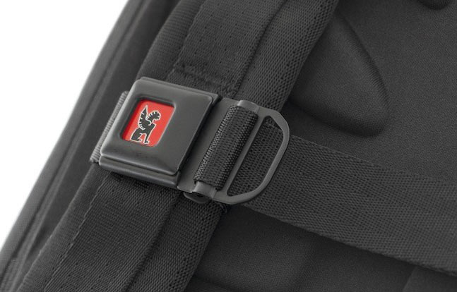 -Sternum strap with iconic mini seatbelt buckle for load distribution