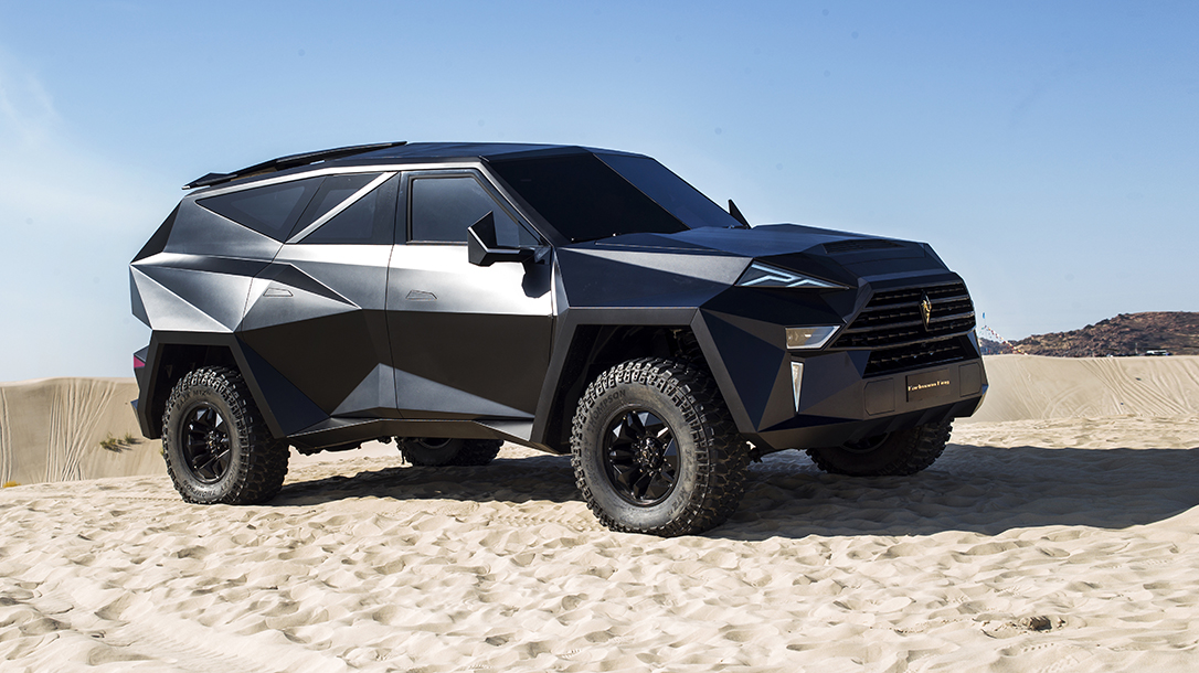 The exterior exudes a rugged angular manliness. Carbon-fiber construction over a steel Ford F-550 frame offers superb strength while allowing the vehicle to be crafted as an object d’art. The sundry facets built into the exterior chassis attract attention as efficiently as they might otherwise refract radar waves. Batman would probably give up the Batmobile in favor of this beast.
